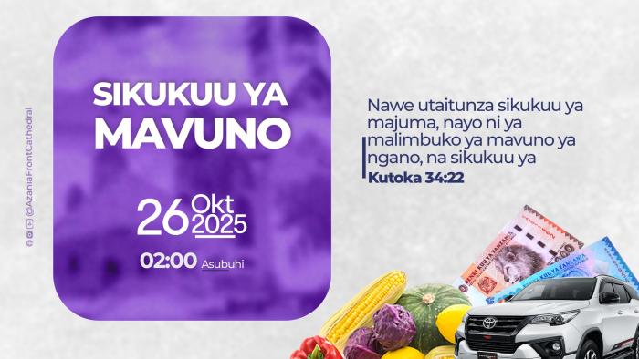 Wapendwa Washarika, tunapenda kuwakaribisha katika ibada maalum ya Sikukuu ya Mavuno kwa mwaka 2025 itakayofanyika katika viwanja vya Usharika wa Kanisa Kuu Azania Front siku ya Jumapili tarehe 26 Oktoba 2025, kuanzia saa 2 kamili asubuhi. Siku hiyo ibada itakuwa moja tu (SWA).
